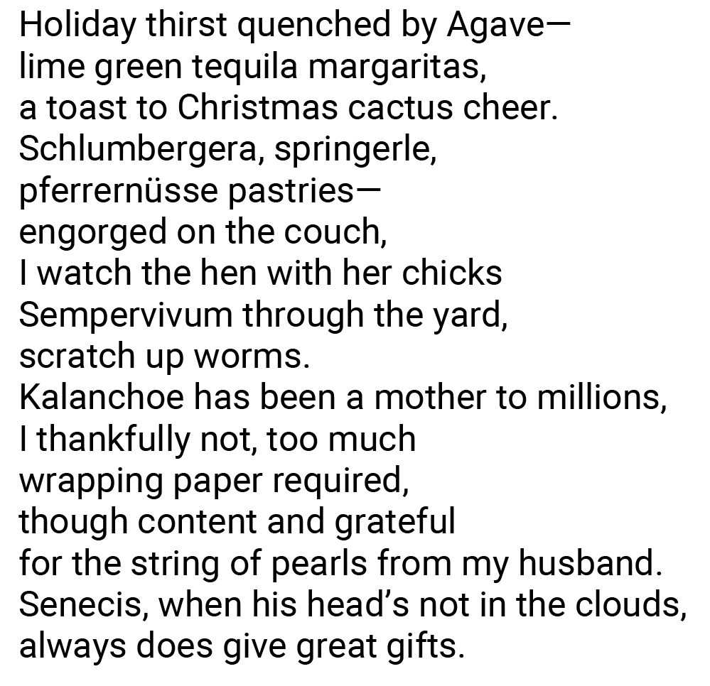 A SUCCULENT CHRISTMAS ~ Christa Fairbrother INSTANT NOODLES: COo0LD TURKEY | VOL. 3 ISS. 3 2023 | COVER FRESH BIRD | Conley COLD TURKEY | Holm ‘TWAS THE HEIST BEFORE CHRISTMAS | Hammerschmidt 🎙 LITTLE LOKI | Fulcher 🎙 THE DRAG QUEEN OF CHRISTMAS | Fleming SNOWED IN | Foot A MOTHER’S HOLIDAY PRAYER | Gilliam WHITE NOIR | Fleming 🎙 TURKEY OR POTATO PANCAKES | Maril 🎙 🎙 GET YOUR OWN SOCKS | Ferrell 🎙 A SUCCULENT CHRISTMAS | Fairbrother SANTINI | Fleming FROZEN (NOT THE MOVIE) | Jacquier 🎙 WE DO THIS EVERY YEAR | Brothers 🎙 UNCERTAIN | Sopranowicz THE CHRISTMAS I CHANNELED CHLOE KIM | Loleng 🎙 JUST ONE WOMAN AND HER SHOVEL | Merrigan 🎙 NOT GIVING | Miller CHICKENS FOR CHRISTMAS | Pratt 🎙 THE OX AND LAMB KEPT TIME | Shy 🎙 🎙 CHRISTMAS NIGHTMARE | Storozynski-Toll 🎙 ASLEEP ON THE LONDON TRAIN | Ukah EXES AND UH-OHS | Walker OVERBOOKED PARTY DISASTER | Fitzgerald PARADOX | Pearce A GHOSTLY SCOTTISH TALE | Heron THE RUSH | Supranowicz COOOLD TURKEY LOVERS | Contributor Bios