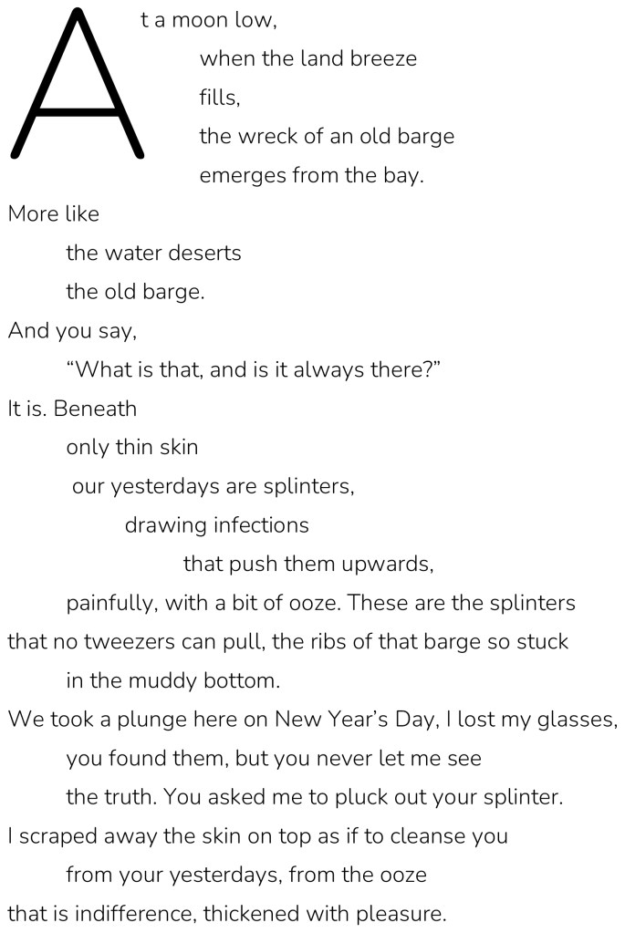 BARGE ~ George W. Shuster, Jr. 🖼️INSTANT NOODLES: CURRENT : COVER 5/2025 🖼️ LAST NIGHT ~ Julian Kanagy DOCKSIDE ~ Bailey BEHIND THE BARS ~ Zhao 🖼️ rapids ~ Fleming 🖼️ TIDE AND TIME ~ Tulodo 🎙 SOLES CRUSHING SOULS ~ Hall 🎙 🖼️ THE WALTX OF LIFE AND DEATH ~ Supranowicz 🖼️ EARLY CHANNELS ~ Becket this view, from a distance ~ Alti (DIS)ASSOCIATING ~ Greenwood ⋆。°✩ SANCTUARY ⋆。°✩ 🖼️ DREAMS OF THE RETURN ~ Bern 🖼️ RUNNING WATER (WE CAME TO NEW YORK) ~ Knapp bodies of water ~ Brand FIGHTING AGAINST THE CURRENT ~ Maril BARGE ~ Shuster 🖼️ LASTLY DELIRIUM AND ON THE NEXT OCCASION ~ Veres 🖼️ THE BREAKING POINT ~ Owens 🖼️ DAVID LYNCH ~ Parker 🖼️ VAGARIES ~ Cass YOU, MY DOG WHELK~ Shuster KINGS AND THE SAN JOAQUIN, WHEN THE RIVERS MEET ~ Barile ON THIS 823RD DAY OF JANUARY WE’VE BOTH GOT WORK TO DO ~ Gilliam A PEACE OFFERING ~ Macias OVER THE OCEAN ~Clements 🖼️LESSONS FROM THE CURRENT ~ Fitzgerald 🖼️ SNIPPETS ~ Fulcher 🎙 IF YOU ARE THERE ~ Nicola 🎙 FLOODS OF 1906 ~ Barile FLORIDA OUT OF MIND ~ Ehrenpreis KEEPING CURRENT ~ Tures GREEN ISLAND AT LOW TIDE ~ Julian Kanagy WAVELENGTH ~ Daugovish 🖼️ LATE WINTER AT THE SACRO MONTE OF CREA ~ Bern 🖼️ PORTAL POWERHOUSE ~ Barile MAHICANITUCK ~Shuster A THOUSAND TINY RIPPLES ~ Tomen 🖼️ PAPER BOATS ~ Contributor Bios 🖼️ Click on the media player to hear an audio recording of this work read by the author.