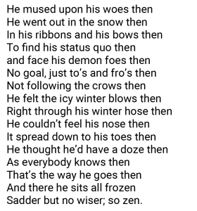 FROZEN (NOT THE MOVIE) ~ Doug Jacquier INSTANT NOODLES: COo0LD TURKEY | VOL. 3 ISS. 3 2023 | COVER FRESH BIRD | Conley COLD TURKEY | Holm ‘TWAS THE HEIST BEFORE CHRISTMAS | Hammerschmidt 🎙 LITTLE LOKI | Fulcher 🎙 THE DRAG QUEEN OF CHRISTMAS | Fleming SNOWED IN | Foot A MOTHER’S HOLIDAY PRAYER | Gilliam WHITE NOIR | Fleming 🎙 TURKEY OR POTATO PANCAKES | Maril 🎙 🎙 GET YOUR OWN SOCKS | Ferrell 🎙 A SUCCULENT CHRISTMAS | Fairbrother SANTINI | Fleming FROZEN (NOT THE MOVIE) | Jacquier 🎙 WE DO THIS EVERY YEAR | Brothers 🎙 UNCERTAIN | Sopranowicz THE CHRISTMAS I CHANNELED CHLOE KIM | Loleng 🎙 JUST ONE WOMAN AND HER SHOVEL | Merrigan 🎙 NOT GIVING | Miller CHICKENS FOR CHRISTMAS | Pratt 🎙 THE OX AND LAMB KEPT TIME | Shy 🎙 🎙 CHRISTMAS NIGHTMARE | Storozynski-Toll 🎙 ASLEEP ON THE LONDON TRAIN | Ukah EXES AND UH-OHS | Walker OVERBOOKED PARTY DISASTER | Fitzgerald PARADOX | Pearce A GHOSTLY SCOTTISH TALE | Heron THE RUSH | Supranowicz COOOLD TURKEY LOVERS | Contributor Bios