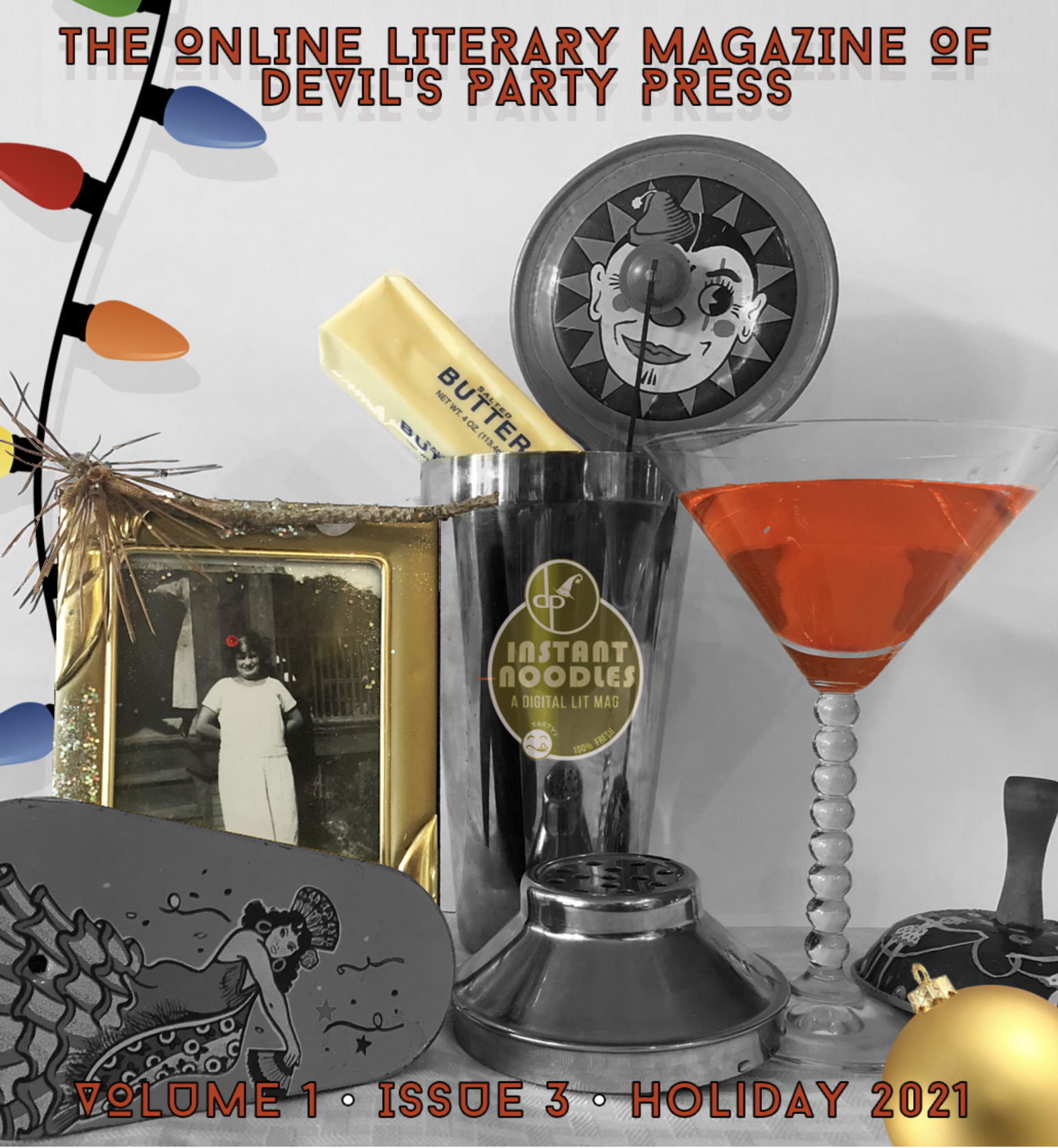 ~ HOT-BUTTERED HOLIDAYS ~ INSTANT NOODLES • VOLUME 1 • ISSUE 3 • HOLIDAYS 2021 INSTANT NOODLES: HOT-BUTTERED HOLIDAYS ~ COVER IF ONLY ~ Beeler BASIC HOLIDAY MATH ~ Hardy THE CHRISTMAS STOCKINGS ~ Salome SURPRISE PARTY ~ Fitzgerald LATE NIGHT ~ Bern NEW YEAR’S 2044 WITH GEORGE ~ Walker GOING HOME ~ Gilliam RECIPE FOR HARD NOODLES ~ Fleming HAPPY HOUR ~ Robinson IT’S ALL STRAW, WORTH NOTHING ~ Beeler MOSS SOUP AND MANICOTTI ~ Johnson STOLEN PLUMS ~ White MOLLY’S MAGIC KITCHEN ~ Schatz MY CHARMING SMILE ~ Supranowicz MISS APPARITION CONTEST ~ Fleming NEW YEAR’S 1969 ~ Bell BUTTER EATERS ~ Gallaher UNDER THE ICE ~ Beeler PARTIAL PORTRAITS ~ Bern NOD AND SMILE ~ Fiorini AUTO-NEUROTICA ~ Shapiro ENTWINED ~ Beeler MISS CORDELIA’S CHRISTMAS ~ Goodridge MEDUSA ~ Beeler SAGA ~ Robinson JACKIE ~ Beeler INSIDES AND OUTS OF POPCORN ~ Gallaher WISTFUL DREAM ~ Beeler DEAR JOHNNY ~ Golladay NEW-YEAR’S-EVE OVER-NIGHT REST-STOP ~ Fleming J’ENTENDS TON COEUR ~ Beeler CHRISTMAS EVE FROM UNDER THE TRAIN TABLE ~ Fulcher STILL HOPEFUL ~ Bern HOT-BUTTERED BIOS Click on the image to view full size.
