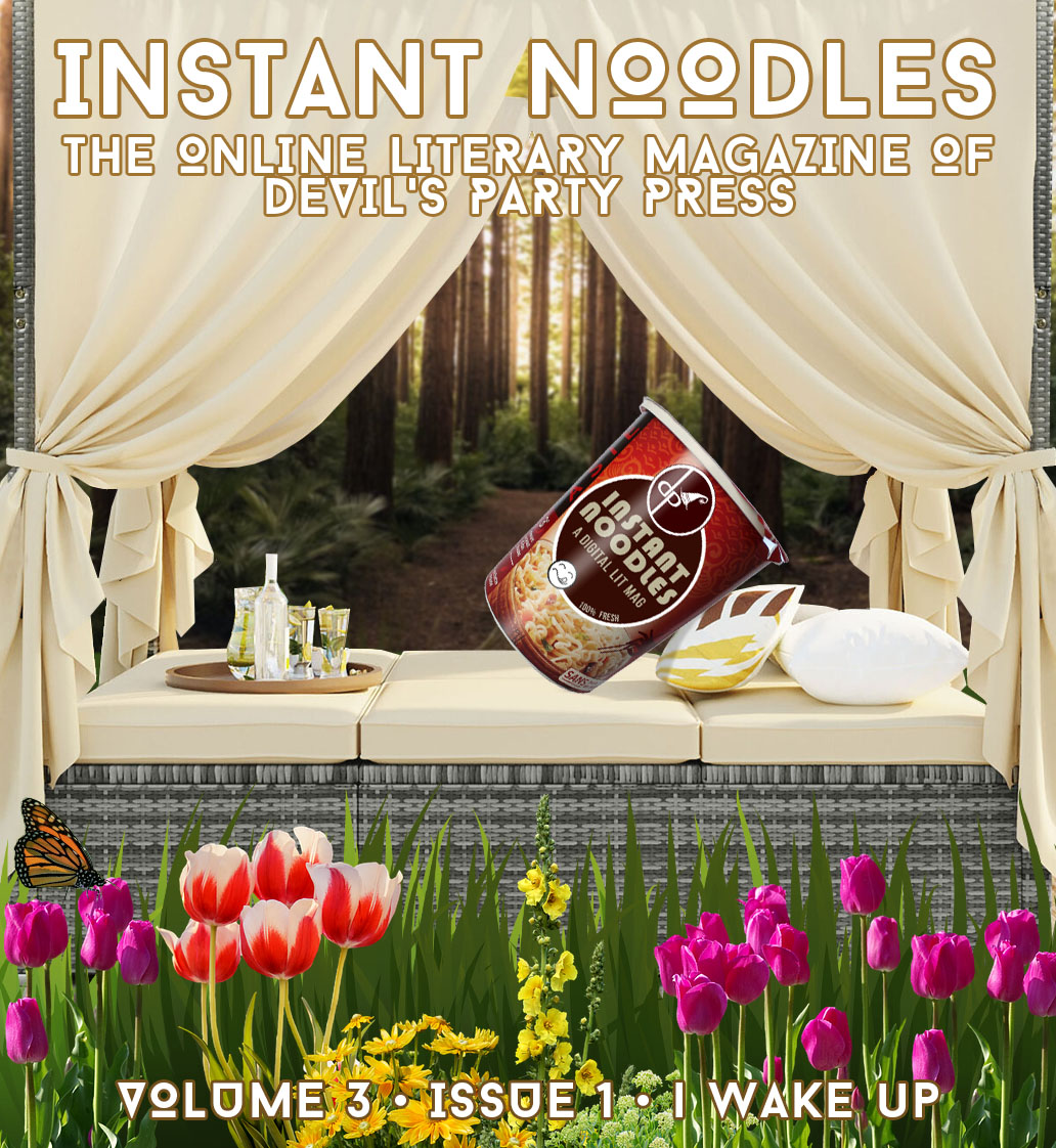 I WAKE UP | SPRING/SUMMER 2023 INSTANT NOODLES: I WAKE UP | VOL3 ISS1 2023 | COVER WALDENLAND | Talbot WANDERING THROUGH THE DAY | Supranowicz AWAKENING APRIL| Fitzgerald MARCH WIND | Golladay HOW TO FIND JIM MORRISON’S GRAVE ON THE SPRING EQUINOX | Hayden CRAZY LOVE 2 | Supranowicz CROCUSES| Barrett BUZZARD DAY | Sapp OVERHEAD | Bartos REFLECTION | Kein CLOSING | Ricketti EVERYTHING ALMOST | Bern BLACK WIDOW SPIDER| Fleming ONE TO BLOOM | Kam Siu MAGNOLIA | Das Gupta OH, RIOTOUS SPRING | Brace I DON’T HAVE A GARDEN | Tefft THE BIG BANG APPLES FOR A PASSPORT | Supranowicz PEEPER POND | Hertenstein THE FLOWER IN QUESTION | Harvey SERENITY AND SQUIRRELS | Jayne SPRING FEVER | Moore FUTURE MINERALS | Kam Siu BIRTHING, A MUSCULAR EVENT | Meyer MEMORIAL DAY | Tefft SHELTERING IN PLACE | Luker M’LADY CALLS | Ganshaw THE LATE FANTASTIC | Conelly THE BLUE COURT | Meyer THREE TREES | Bern BORN ANEW| Ganshaw RESURRECTING SUSAN| Walker LINKS | Ricketti APRIL MAY BE THE CRUELEST MONTH | Barrett EGGS, BACON, and CAROLINA REAPERS | Rodriguez THE BIRDS OF KINGS CROSSING | Golladay RETURN | Kam Siu ANATOMY OF A POEM | Muscatello METAMORPHOSIS | Fitzgerald UNSEEN CIRCLERS DANCE | Bern CIRCLES| Ricketti REBOOT | Maril MARKERS | Muscatello THE AWAKENING TOUCH | Fitzgerald BIRCHES | Tefft SUISIO | Allder BLUE AND WHITE ABOVE GREEN| Barrett COLD BEGETS WARMTH| Ganshaw STARFIRE| Golladay LOST IN THE GARDEN | Supranowicz WIDE-AWAKE WRITERS & ARTISTS | CONTRIBUTOR BIOS Click on the image to view full size. Welcome to the new Instant Noodles website! The image is the cover for our first issue of 2023. It shows instant noodles waking up on a bed in a field of flowers. Ahhhhh lovely.