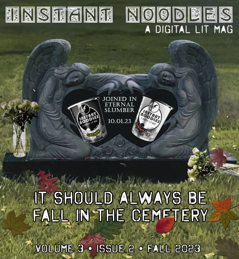 IT SHOULD ALWAYS BE FALL IN THE CEMETERY | FALL 2023 INSTANT NOODLES: IT SHOULD ALWAYS BE FALL IN THE CEMETERY| VOL. 3 ISS. 2 2023 | COVER RAWTHCHILD | Cantu GRIEF IS THE HALLOWEEN TRICK YOU LEAST EXPECT | Ward R.I.P. | Fitzgerald CEMETERY STATUARY | Holm AUTUMN TALKS TO HER THERAPIST | Barney 🎙 LIPSTICKS THE WITCHES WORE TO THE HALLOWEEN BALL 🎙 | Berkman 🎙 WHISTLING THROUGH THE GRAVEYARD 🎙 | Walker LIFE AFTER… | DePaolo SELF-PORTRAIT AS THE ELEMENTS | Lehvonen-Shawki WITCH WINDOW | Finney SAD LIKE A DAY OF THE DEAD LAMP | Meyer 🎙 INTO THE PIT 🎙 | Stevenson GRAVEYARD APPLES | Ives DARKNESS | Das Gupta AT DUSK | Berry QUANDARY | Skinner ANGRY EMPTINESS | Supranowicz 🎙 SURPRISE ME 🎙 | Maril 🎙 SHADOW BOXING 🎙 | Wold VALLEY VIEW CEMETERY | Janicke 🎙 FALLING 🎙 | Smith NO PEACEFUL REST! | Das Gupta GRAVESIDE VOYEUR | Meyer WINTER CHURCHYARD | Osborne A LOVER OF THE OLD WAYS | Burke 🎙 CONSUMED 🎙 | Daone BOXED IN | Kelly WHEN DORMANCY COMES | Meyer THE HAPPINESS OF OTHERS (MY LIFE AS A BEKSINSKI PAINTING) | DePaolo 🎙 CRYSTAL BALL 🎙| Berkman MUTED | Lehvonen-Shawki LOVERS’ LEASE | Finney A LAST CHANCE | Barney MOURNERS | Holm 🎙 DEAD MAN’S HAND 🎙 | Stevenson WAITING FOR AUTUMN | Barney AUTUMN IN ARLINGTON | Finney AUTUMN | Lehvonen-Shawki THIS SPACE INTENTIONALLY LEFT BLANK | DePaolo 🎙 STEP OF THE DEAD 🎙 | Stevenson 🎙 THIS IS THE STORY I WANTED TO TELL YOU 🎙 | Berkman CEMETERY SADNESS | Holm CEMETERY RESIDENTS | CONTRIBUTOR BIOS Click on the image to view full size. Welcome to the new Instant Noodles website! The image is the cover for our fall 2023 issue. It depicts a headstone with two angels cradling cups of instant noodles, one chicken, one shrimp.