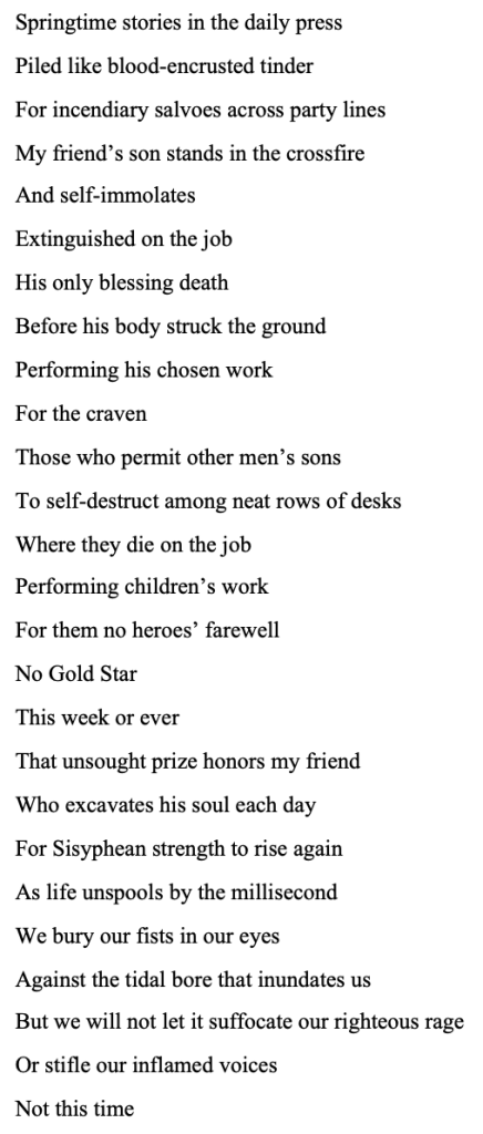 MEMORIAL DAY – Marianne Tefft INSTANT NOODLES: I WAKE UP | VOL3 ISS1 2023 | COVER WALDENLAND | Talbot WANDERING THROUGH THE DAY | Supranowicz AWAKENING APRIL| Fitzgerald MARCH WIND | Golladay HOW TO FIND JIM MORRISON’S GRAVE ON THE SPRING EQUINOX | Hayden CRAZY LOVE 2 | Supranowicz CROCUSES| Barrett BUZZARD DAY | Sapp OVERHEAD | Bartos REFLECTION | Kein CLOSING | Ricketti EVERYTHING ALMOST | Bern BLACK WIDOW SPIDER| Fleming ONE TO BLOOM | Kam Siu MAGNOLIA | Das Gupta OH, RIOTOUS SPRING | Brace I DON’T HAVE A GARDEN | Tefft THE BIG BANG APPLES FOR A PASSPORT | Supranowicz PEEPER POND | Hertenstein THE FLOWER IN QUESTION | Harvey SERENITY AND SQUIRRELS | Jayne SPRING FEVER | Moore FUTURE MINERALS | Kam Siu BIRTHING, A MUSCULAR EVENT | Meyer MEMORIAL DAY | Tefft SHELTERING IN PLACE | Luker M’LADY CALLS | Ganshaw THE LATE FANTASTIC | Conelly THE BLUE COURT | Meyer THREE TREES | Bern BORN ANEW| Ganshaw RESURRECTING SUSAN| Walker LINKS | Ricketti APRIL MAY BE THE CRUELEST MONTH | Barrett EGGS, BACON, and CAROLINA REAPERS | Rodriguez THE BIRDS OF KINGS CROSSING | Golladay RETURN | Kam Siu ANATOMY OF A POEM | Muscatello METAMORPHOSIS | Fitzgerald UNSEEN CIRCLERS DANCE | Bern CIRCLES| Ricketti REBOOT | Maril MARKERS | Muscatello THE AWAKENING TOUCH | Fitzgerald BIRCHES | Tefft SUISIO | Allder BLUE AND WHITE ABOVE GREEN| Barrett COLD BEGETS WARMTH| Ganshaw STARFIRE| Golladay LOST IN THE GARDEN | Supranowicz WIDE-AWAKE WRITERS & ARTISTS | CONTRIBUTOR BIOS
