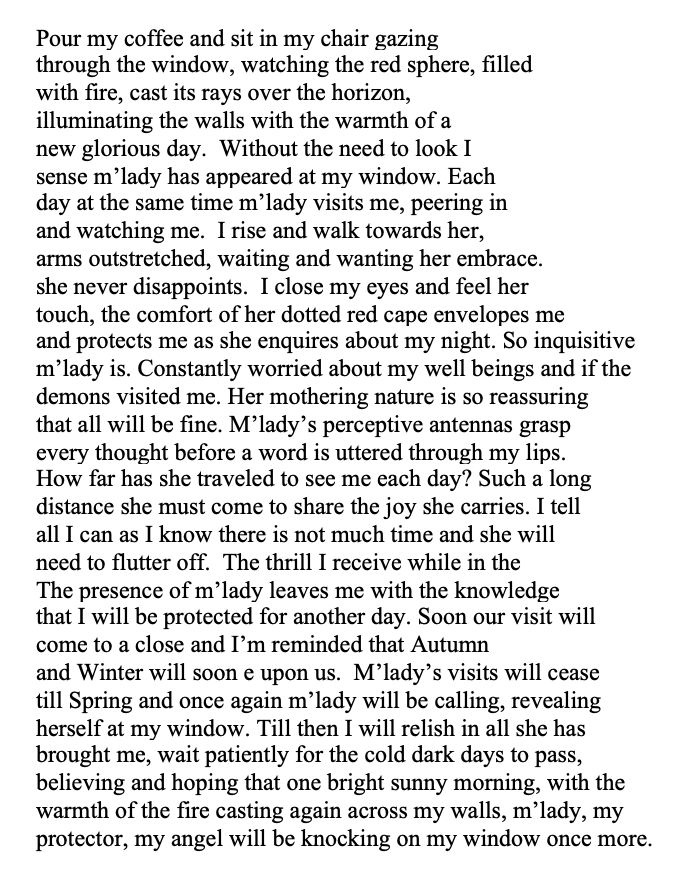 M’LADY CALLS – John Ganshaw INSTANT NOODLES: I WAKE UP | VOL3 ISS1 2023 | COVER WALDENLAND | Talbot WANDERING THROUGH THE DAY | Supranowicz AWAKENING APRIL| Fitzgerald MARCH WIND | Golladay HOW TO FIND JIM MORRISON’S GRAVE ON THE SPRING EQUINOX | Hayden CRAZY LOVE 2 | Supranowicz CROCUSES| Barrett BUZZARD DAY | Sapp OVERHEAD | Bartos REFLECTION | Kein CLOSING | Ricketti EVERYTHING ALMOST | Bern BLACK WIDOW SPIDER| Fleming ONE TO BLOOM | Kam Siu MAGNOLIA | Das Gupta OH, RIOTOUS SPRING | Brace I DON’T HAVE A GARDEN | Tefft THE BIG BANG APPLES FOR A PASSPORT | Supranowicz PEEPER POND | Hertenstein THE FLOWER IN QUESTION | Harvey SERENITY AND SQUIRRELS | Jayne SPRING FEVER | Moore FUTURE MINERALS | Kam Siu BIRTHING, A MUSCULAR EVENT | Meyer MEMORIAL DAY | Tefft SHELTERING IN PLACE | Luker M’LADY CALLS | Ganshaw THE LATE FANTASTIC | Conelly THE BLUE COURT | Meyer THREE TREES | Bern BORN ANEW| Ganshaw RESURRECTING SUSAN| Walker LINKS | Ricketti APRIL MAY BE THE CRUELEST MONTH | Barrett EGGS, BACON, and CAROLINA REAPERS | Rodriguez THE BIRDS OF KINGS CROSSING | Golladay RETURN | Kam Siu ANATOMY OF A POEM | Muscatello METAMORPHOSIS | Fitzgerald UNSEEN CIRCLERS DANCE | Bern CIRCLES| Ricketti REBOOT | Maril MARKERS | Muscatello THE AWAKENING TOUCH | Fitzgerald BIRCHES | Tefft SUISIO | Allder BLUE AND WHITE ABOVE GREEN| Barrett COLD BEGETS WARMTH| Ganshaw STARFIRE| Golladay LOST IN THE GARDEN | Supranowicz WIDE-AWAKE WRITERS & ARTISTS | CONTRIBUTOR BIOS