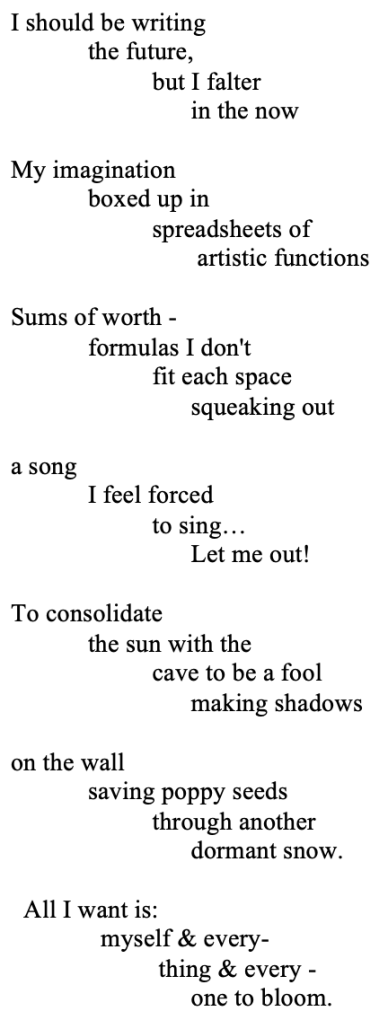 ONE TO BLOOM- Colleen Kam Siu INSTANT NOODLES: I WAKE UP | VOL3 ISS1 2023 | COVER WALDENLAND | Talbot WANDERING THROUGH THE DAY | Supranowicz AWAKENING APRIL| Fitzgerald MARCH WIND | Golladay HOW TO FIND JIM MORRISON’S GRAVE ON THE SPRING EQUINOX | Hayden CRAZY LOVE 2 | Supranowicz CROCUSES| Barrett BUZZARD DAY | Sapp OVERHEAD | Bartos REFLECTION | Kein CLOSING | Ricketti EVERYTHING ALMOST | Bern BLACK WIDOW SPIDER| Fleming ONE TO BLOOM | Kam Siu MAGNOLIA | Das Gupta OH, RIOTOUS SPRING | Brace I DON’T HAVE A GARDEN | Tefft THE BIG BANG APPLES FOR A PASSPORT | Supranowicz PEEPER POND | Hertenstein THE FLOWER IN QUESTION | Harvey SERENITY AND SQUIRRELS | Jayne SPRING FEVER | Moore FUTURE MINERALS | Kam Siu BIRTHING, A MUSCULAR EVENT | Meyer MEMORIAL DAY | Tefft SHELTERING IN PLACE | Luker M’LADY CALLS | Ganshaw THE LATE FANTASTIC | Conelly THE BLUE COURT | Meyer THREE TREES | Bern BORN ANEW| Ganshaw RESURRECTING SUSAN| Walker LINKS | Ricketti APRIL MAY BE THE CRUELEST MONTH | Barrett EGGS, BACON, and CAROLINA REAPERS | Rodriguez THE BIRDS OF KINGS CROSSING | Golladay RETURN | Kam Siu ANATOMY OF A POEM | Muscatello METAMORPHOSIS | Fitzgerald UNSEEN CIRCLERS DANCE | Bern CIRCLES| Ricketti REBOOT | Maril MARKERS | Muscatello THE AWAKENING TOUCH | Fitzgerald BIRCHES | Tefft SUISIO | Allder BLUE AND WHITE ABOVE GREEN| Barrett COLD BEGETS WARMTH| Ganshaw STARFIRE| Golladay LOST IN THE GARDEN | Supranowicz WIDE-AWAKE WRITERS & ARTISTS | CONTRIBUTOR BIOS