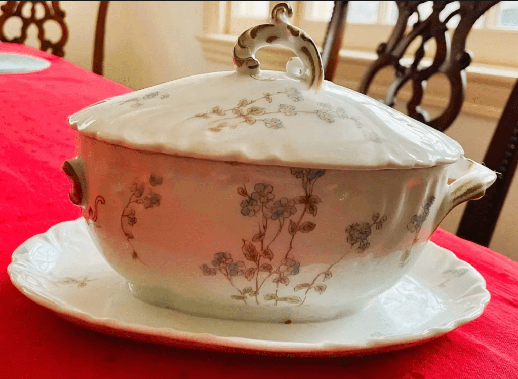 Be generous with that gravy. I think of it as an enhancement, one of those little details so important to have on the table alongside the relishes, olives, pickles and cranberry sauce. Rarely, in sets of antique dishes, does one find a gravy boat that is not chipped, cracked, or the cover missing. Such is the price it paid for being a much-loved dish.