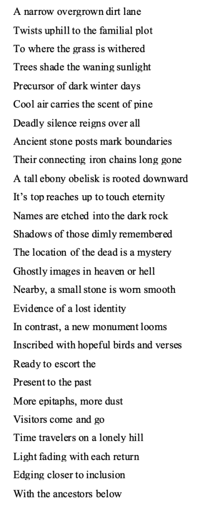 R.I.P. ~ Jane H. Fitzgerald INSTANT NOODLES: IT SHOULD ALWAYS BE FALL IN THE CEMETERY| VOL. 3 ISS. 2 2023 | COVER RAWTHCHILD | Cantu GRIEF IS THE HALLOWEEN TRICK YOU LEAST EXPECT | Ward R.I.P. | Fitzgerald CEMETERY STATUARY | Holm AUTUMN TALKS TO HER THERAPIST | Barney 🎙 LIPSTICKS THE WITCHES WORE TO THE HALLOWEEN BALL 🎙 | Berkman 🎙 WHISTLING THROUGH THE GRAVEYARD 🎙 | Walker LIFE AFTER… | DePaolo SELF-PORTRAIT AS THE ELEMENTS | Lehvonen-Shawki WITCH WINDOW | Finney SAD LIKE A DAY OF THE DEAD LAMP | Meyer 🎙 INTO THE PIT 🎙 | Stevenson GRAVEYARD APPLES | Ives DARKNESS | Das Gupta AT DUSK | Berry QUANDARY | Skinner ANGRY EMPTINESS | Supranowicz 🎙 SURPRISE ME 🎙 | Maril 🎙 SHADOW BOXING 🎙 | Wold VALLEY VIEW CEMETERY | Janicke 🎙 FALLING 🎙 | Smith NO PEACEFUL REST! | Das Gupta GRAVESIDE VOYEUR | Meyer WINTER CHURCHYARD | Osborne A LOVER OF THE OLD WAYS | Burke 🎙 CONSUMED 🎙 | Daone BOXED IN | Kelly WHEN DORMANCY COMES | Meyer THE HAPPINESS OF OTHERS (MY LIFE AS A BEKSINSKI PAINTING) | DePaolo 🎙 CRYSTAL BALL 🎙| Berkman MUTED | Lehvonen-Shawki LOVERS’ LEASE | Finney A LAST CHANCE | Barney MOURNERS | Holm 🎙 DEAD MAN’S HAND 🎙 | Stevenson WAITING FOR AUTUMN | Barney AUTUMN IN ARLINGTON | Finney AUTUMN | Lehvonen-Shawki THIS SPACE INTENTIONALLY LEFT BLANK | DePaolo 🎙 STEP OF THE DEAD 🎙 | Stevenson 🎙 THIS IS THE STORY I WANTED TO TELL YOU 🎙 | Berkman CEMETERY SADNESS | Holm CEMETERY RESIDENTS | CONTRIBUTOR BIOS