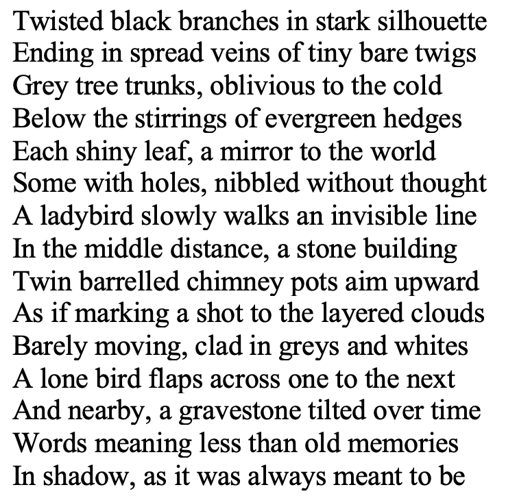 WINTER CHURCHYARD ~ Howard M. Osborne INSTANT NOODLES: IT SHOULD ALWAYS BE FALL IN THE CEMETERY| VOL. 3 ISS. 2 2023 | COVER RAWTHCHILD | Cantu GRIEF IS THE HALLOWEEN TRICK YOU LEAST EXPECT | Ward R.I.P. | Fitzgerald CEMETERY STATUARY | Holm AUTUMN TALKS TO HER THERAPIST | Barney 🎙 LIPSTICKS THE WITCHES WORE TO THE HALLOWEEN BALL 🎙 | Berkman 🎙 WHISTLING THROUGH THE GRAVEYARD 🎙 | Walker LIFE AFTER… | DePaolo SELF-PORTRAIT AS THE ELEMENTS | Lehvonen-Shawki WITCH WINDOW | Finney SAD LIKE A DAY OF THE DEAD LAMP | Meyer 🎙 INTO THE PIT 🎙 | Stevenson GRAVEYARD APPLES | Ives DARKNESS | Das Gupta AT DUSK | Berry QUANDARY | Skinner ANGRY EMPTINESS | Supranowicz 🎙 SURPRISE ME 🎙 | Maril 🎙 SHADOW BOXING 🎙 | Wold VALLEY VIEW CEMETERY | Janicke 🎙 FALLING 🎙 | Smith NO PEACEFUL REST! | Das Gupta GRAVESIDE VOYEUR | Meyer WINTER CHURCHYARD | Osborne A LOVER OF THE OLD WAYS | Burke 🎙 CONSUMED 🎙 | Daone BOXED IN | Kelly WHEN DORMANCY COMES | Meyer THE HAPPINESS OF OTHERS (MY LIFE AS A BEKSINSKI PAINTING) | DePaolo 🎙 CRYSTAL BALL 🎙| Berkman MUTED | Lehvonen-Shawki LOVERS’ LEASE | Finney A LAST CHANCE | Barney MOURNERS | Holm 🎙 DEAD MAN’S HAND 🎙 | Stevenson WAITING FOR AUTUMN | Barney AUTUMN IN ARLINGTON | Finney AUTUMN | Lehvonen-Shawki THIS SPACE INTENTIONALLY LEFT BLANK | DePaolo 🎙 STEP OF THE DEAD 🎙 | Stevenson 🎙 THIS IS THE STORY I WANTED TO TELL YOU 🎙 | Berkman CEMETERY SADNESS | Holm CEMETERY RESIDENTS | CONTRIBUTOR BIOS